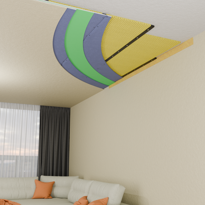 Использование системы «УЛЬТРА» значительно улучшает звукоизоляционные характеристики потолка. Вибропрофиль и мембрана создают барьер для воздушного и ударного шума. Лента F100 и герметик обеспечивают герметичность системы, предотвращая утечку звука через стыки, минеральная плита поглощает остаточные шумы. Совместное использование этих материалов формирует многоуровневую защиту от шума благодаря синергии их свойств.